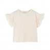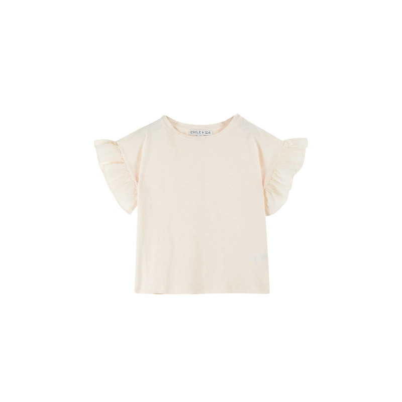 Ce tee-shirt en coton biologique flammé crème rosé séduit par sa matière toute douce et agréable à porter. Sa coupe droite assure un tombé naturel et confortable, tandis que son encolure ronde est délicatement terminée par un bord-côte. Les volants en voile de coton ton sur ton apportent une touche raffinée et aérienne en guise de manches. Une double surpiqûre autour de la base vient parfaire les finitions avec soin. Un essentiel délicat, facile à associer au quotidien.