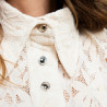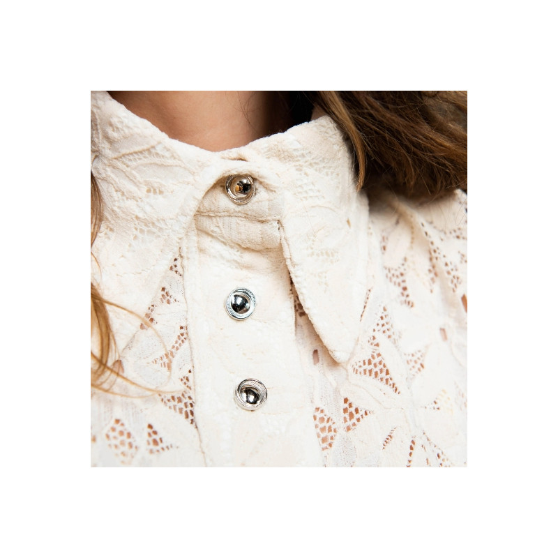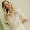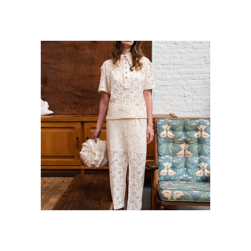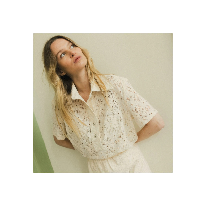 Le polo iconique G.M se réinvente dans une dentelle inédite au motif marguerite, inspirée des années 1960. Sa coupe droite, fidèle à sa silhouette signature, offre un tombé structuré et élégant. Le col esprit 70’s vient renforcer son allure rétro, tandis que les plis creux au dos et la découpe western apportent du relief et du caractère à la pièce. Le travail de la dentelle crée de subtils jeux de transparence, mêlant féminité et modernité. Confectionné à Paris, ce modèle s’inscrit dans un vestiaire à la fois singulier et intemporel. À porter en ensemble avec la jupe Allure pour un look affirmé.