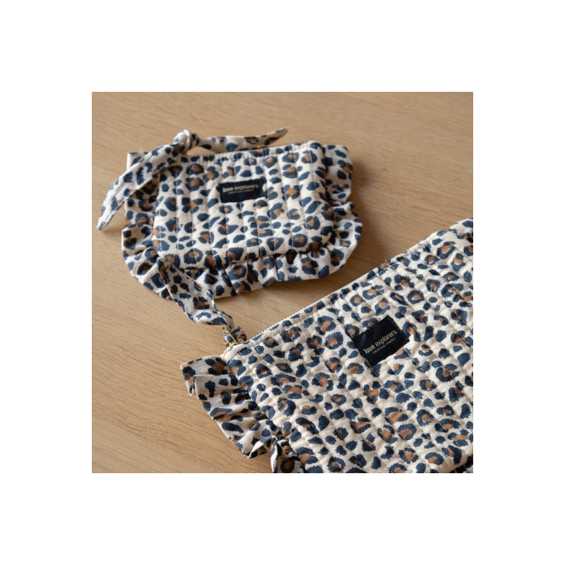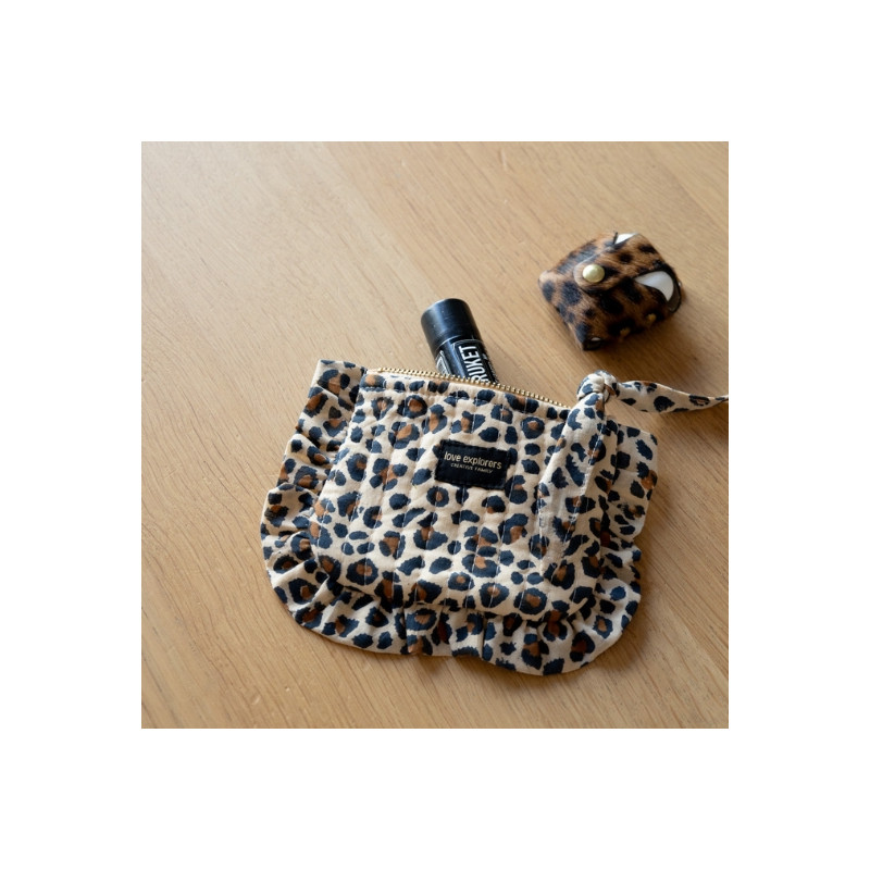 Pochette plate S signée Love Explorers. Petit format compact idéal pour porte-monnaie ou petits essentiels. Imprimé léopard, matelassée, fermeture zippée avec nœud – pratique et stylée au quotidien.