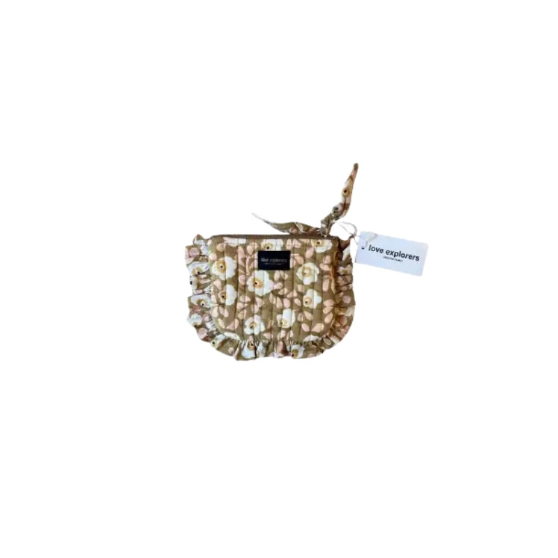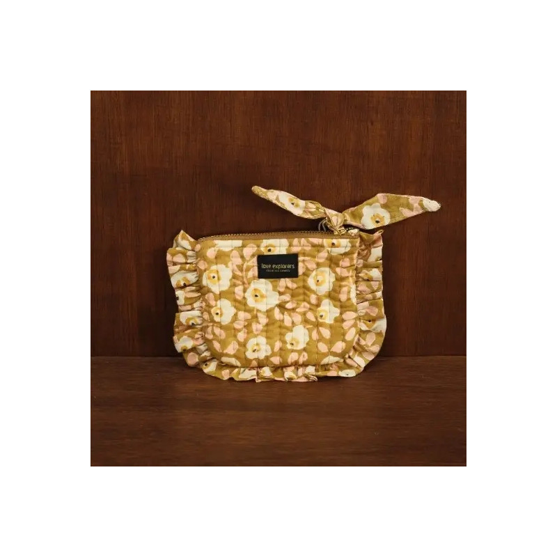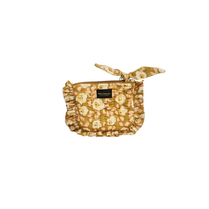 Pochette plate S Love Explorers, imprimé floral matelassé et zip à nœud. Parfaite pour vos petits essentiels. Fabrication artisanale avec possibles irrégularités.