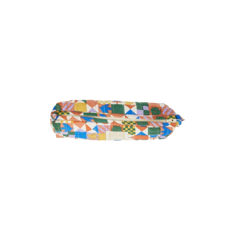 La trousse NILA de Bonheur du Jour est idéale pour ranger crayons, feutres et petits trésors. Confectionnée en popeline 100 % coton matelassée et imprimée artisanalement en block print, elle séduit par ses couleurs vives et son pompon assorti. Compacte et pratique (22 x 7,5 cm), elle se ferme facilement grâce à son zip et se glisse partout.