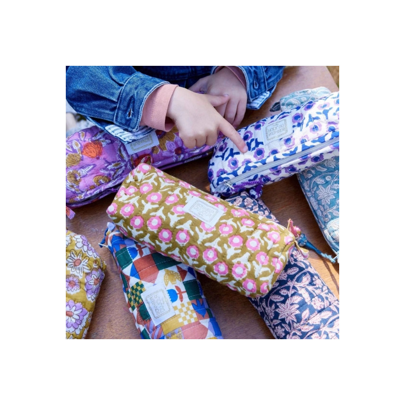 Trousse matelassée en coton 100 %, imprimée artisanalement en block print. Pratique et colorée avec son pompon assorti, elle se ferme par zip et offre un format compact de 22 x 7,5 cm pour ranger crayons et petits trésors.