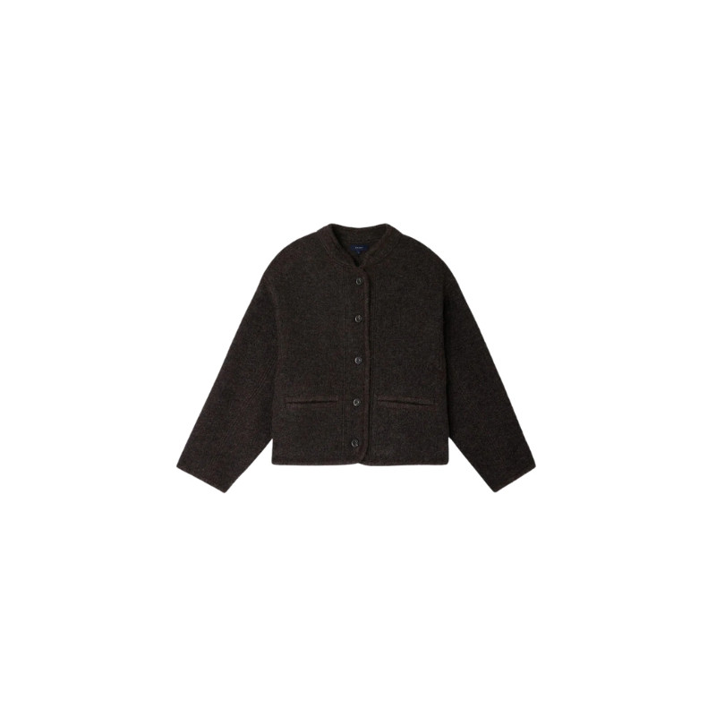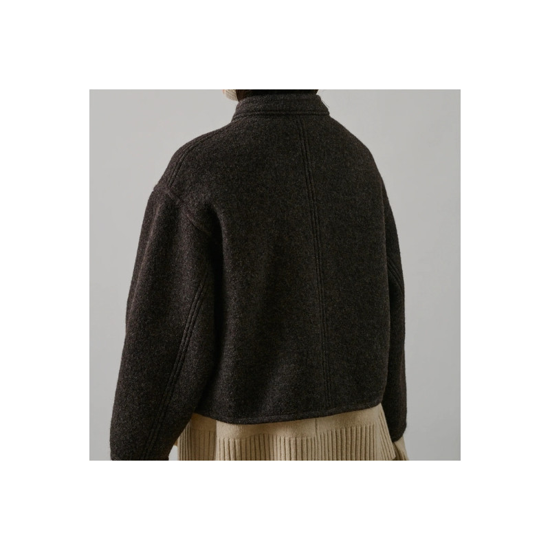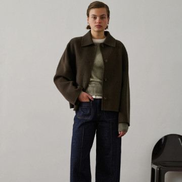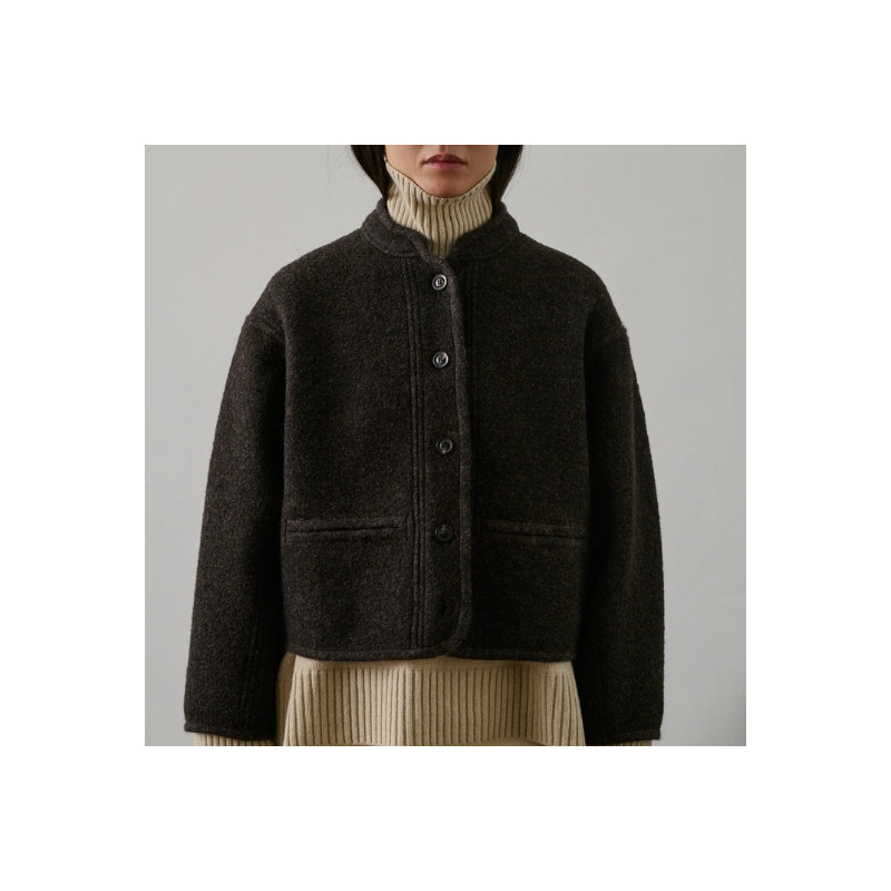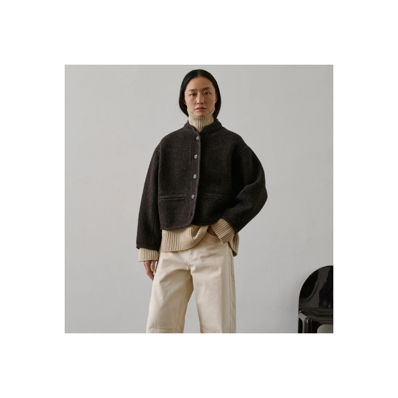 La veste Olympe de chez Soeur est une veste courte au volume ample et rond, confectionnée en laine vierge bouillie. Elle présente des manches longues à emmanchures larges, un col montant et une ouverture boutonnée sur le devant. Les finitions sont soignées avec une tresse autrichienne qui souligne son allure raffinée.