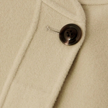 La veste Olympe de la marque Soeur est une veste courte et ample en laine vierge bouillie, avec col montant, ouverture boutonnée et finitions gansées d’une tresse autrichienne.