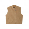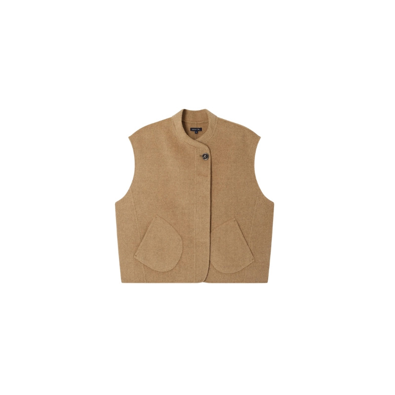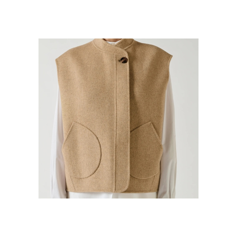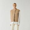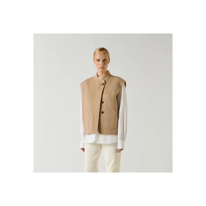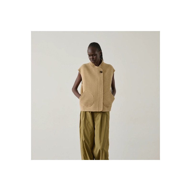 Le gilet sans manches ADELINE revisite l’esprit du vestiaire tailoring avec une silhouette moderne et enveloppante. Inspiré de la veste iconique WINDSOR, il reprend ses lignes épurées et ses poches plaquées arrondies, qui apportent du caractère tout en accentuant son volume oversize. Sa coupe courte et ample, associée à des épaules tombantes, crée une allure structurée mais décontractée, idéale pour jouer les superpositions.
