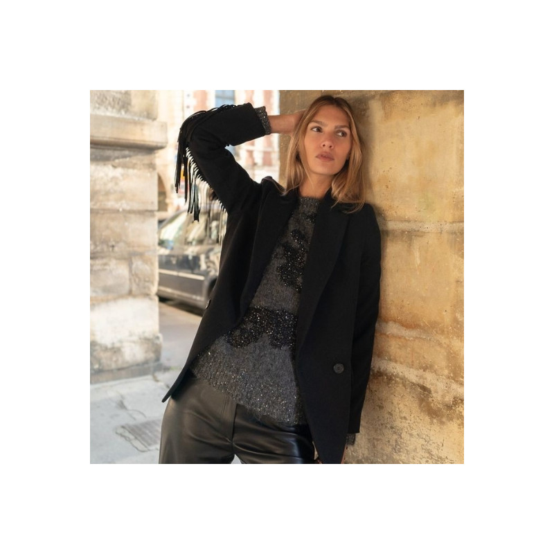 La veste Stephen à franges en noir est une pièce audacieuse au style résolument affirmé. Sa coupe structurée dessine une silhouette nette et élégante, facile à porter ouverte ou fermée selon l’allure recherchée. Les franges décoratives apportent du mouvement et une touche de caractère, créant un contraste subtil entre sobriété et originalité. Polyvalente, elle s’associe aussi bien à un jean pour un look casual chic qu’à une tenue plus sophistiquée avec une blouse, un pantalon habillé ou une robe.