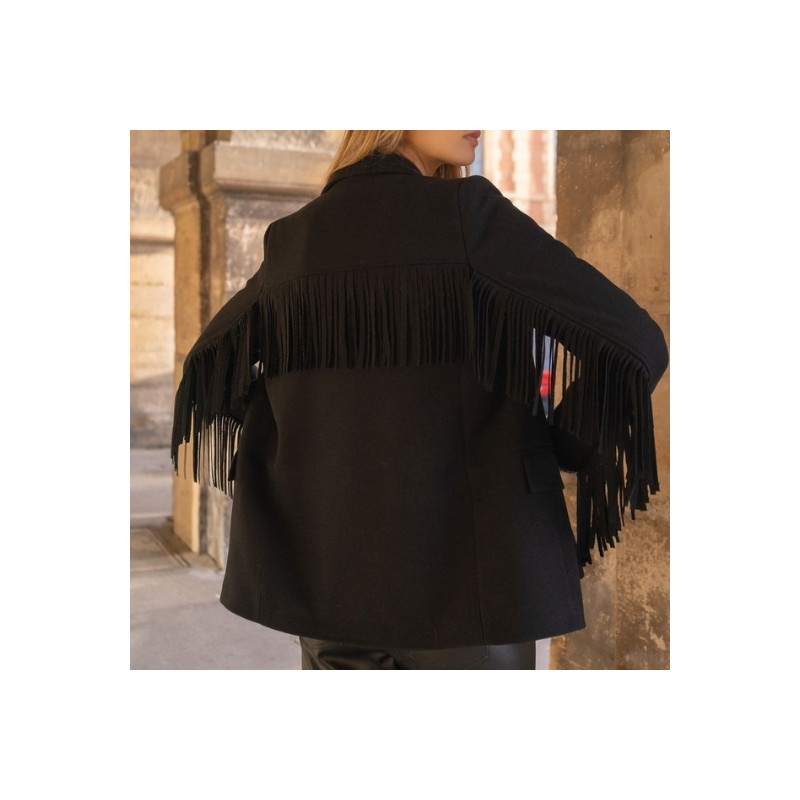 La veste Stephen à franges en noir présente une coupe structurée et moderne. Ses franges apportent du caractère et du mouvement. Elle se porte ouverte ou fermée selon le style. Elle s’adapte à des looks casual comme plus habillés.