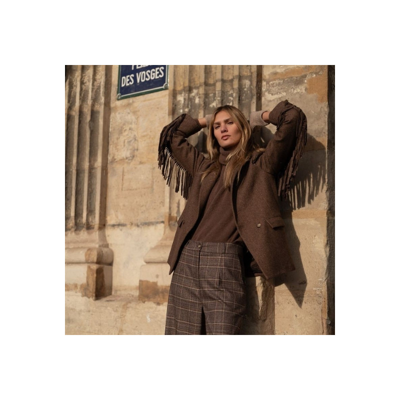 La veste Stephen à franges en marron présente une coupe structurée et moderne. Ses franges apportent du caractère et du mouvement. Elle se porte ouverte ou fermée selon le style. Elle s’associe facilement à des looks casual ou plus habillés.