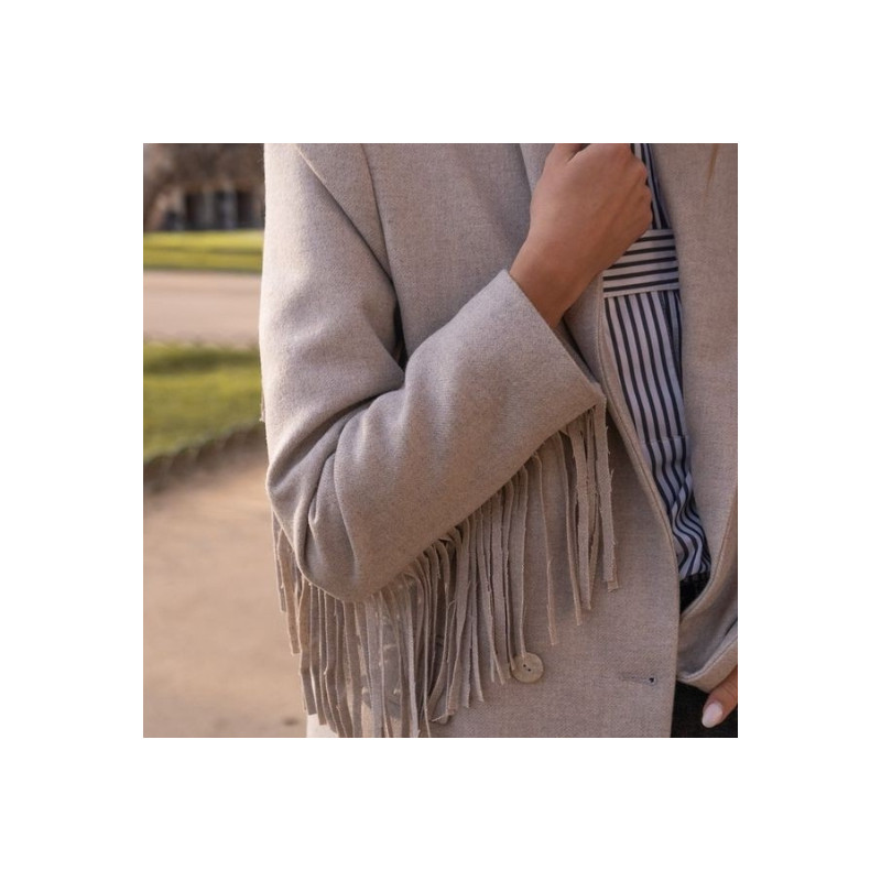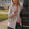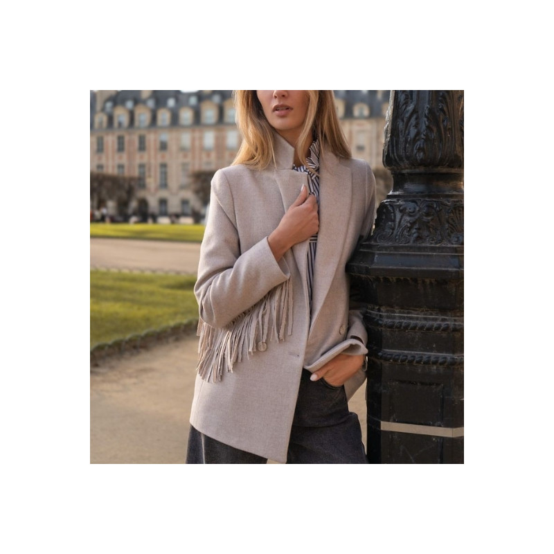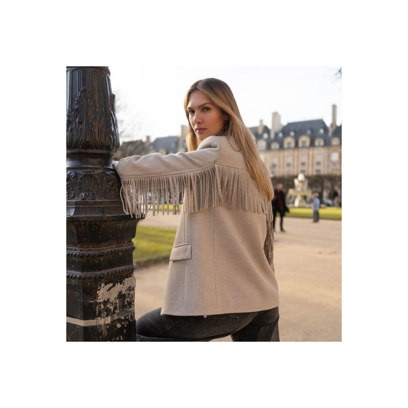 La veste Stephen à franges en beige-gris présente une coupe structurée et moderne. Ses franges ajoutent du mouvement et de la personnalité. Elle se porte ouverte ou fermée selon le style. Elle s’adapte à des looks casual comme plus habillés.