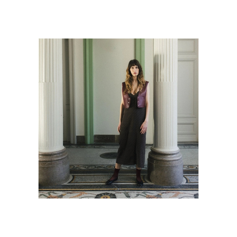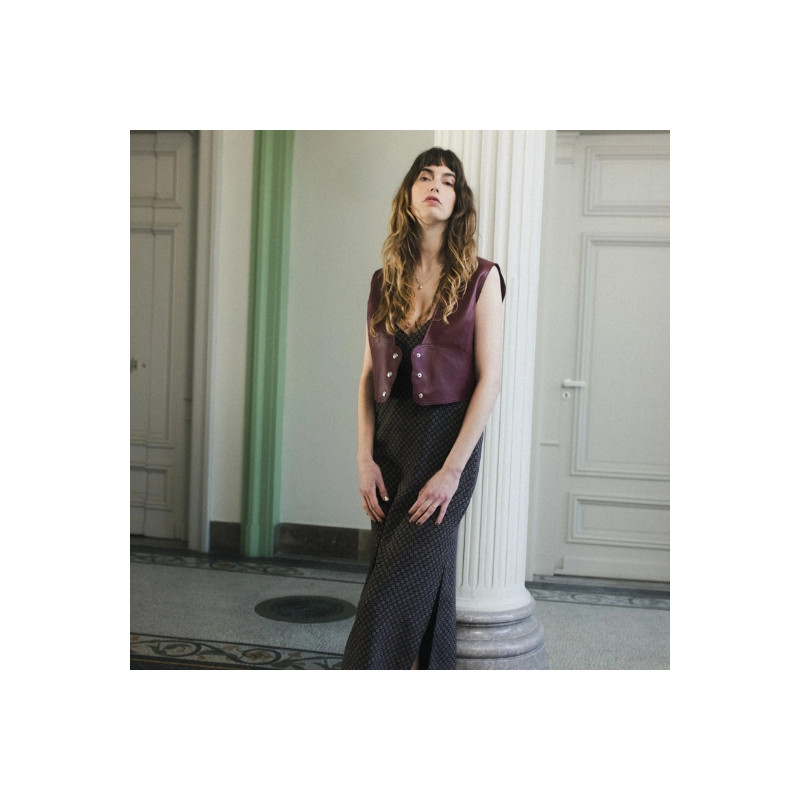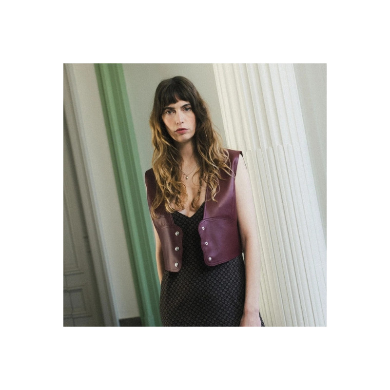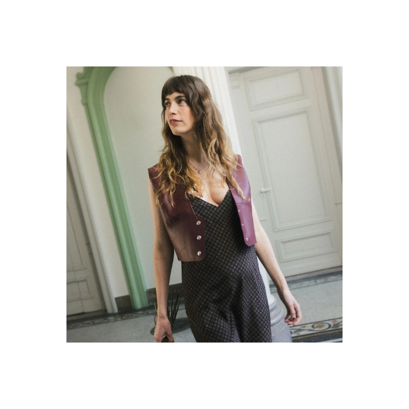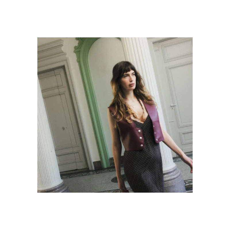 Jessie est une pièce en cuir bordeaux à l’esprit vintage et rock, à la coupe droite et aux détails western. À porter en top ou en petite veste, elle allie caractère et élégance au quotidien.